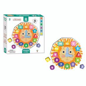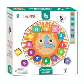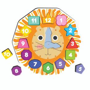 Relógio e peças de encaixe em madeira de 9 mm de fácil manipulação pelas crianças, resistentes e coloridas. O Leãozinho tem 02 ponteiros que se movimentam para marcar as horas e dois suportes por trás para ficar inclinado e facilitar a brincadeira.