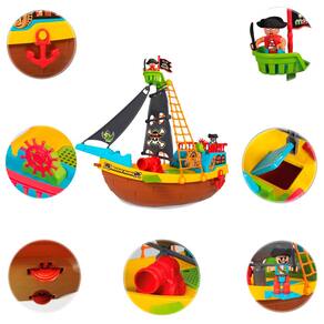 O Barco Pirata possui 23 peças: 1 Casco com 3 rodinhas, 1 convés, 1 mastro de proa, 1 porta calabouço, 1 vela, 1 mirante, 1 bandeira, 1 vela frontal, 1 prancha, 1 canhão, 1 âncora, 2 escadas de corda, 1 cabine de comando, 3 cercas, 1 base timão, 1 timão, 2 bonecos piratas e 2 espadas.
