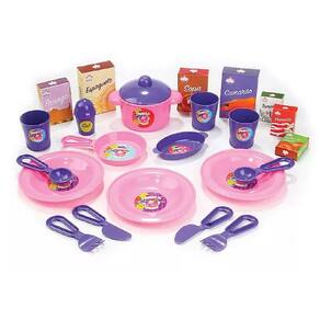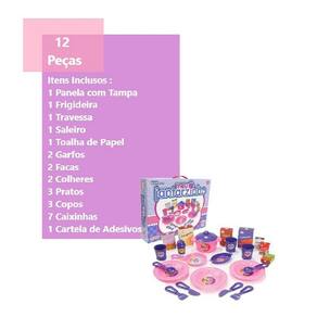 Itens Inclusos : 1 Panela com Tampa 1 Frigideira 1 Travessa 1 Saleiro 1 Toalha de Papel 2 Garfos 2 Facas 2 Colheres 3 Pratos 3 Copos 7 Caixinhas 1 Cartela de Adesivos