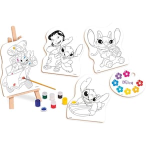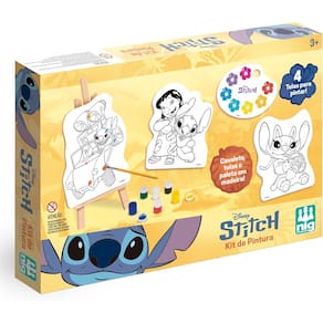 O que vem no kit: 4 telas ilustradas com desenhos do Stitch 1 cavalete de madeira (45 cm) para apoiar as telas 1 paleta de pintura em madeira reflorestada 6 tintas guache atóxicas e coloridas 1 pincel