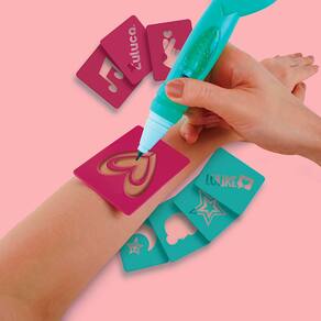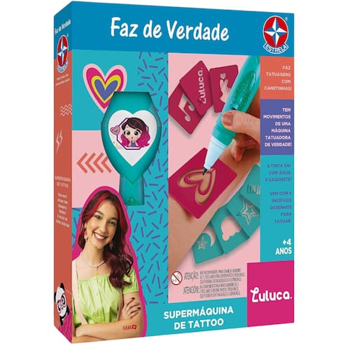 A tatuagem é uma tendência que agora pode fazer parte do mundo infantil. A Supermáquina de Tattoo da Luluca faz tatuagens fashion e que saem com água e sabonete. A máquina tem os movimentos de uma tatuadora de verdade e funciona com canetinhas de tinta lavável! São 8 opções de estênceis com temática da Luluca para a criança escolher. Basta encaixar a canetinha no interior da máquina, recolocar a tampa e apertar para tatuar. Para remover a tatuagem, lavar com água e sabonete. Podem ser necessárias várias lavagens até que a tatuagem seja completamente apagada.