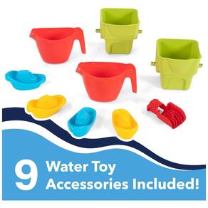 Esse brinquedo é perfeito para crianças e bebês que adoram brincar ao ar livre com água. Ela pode ser usada tanto como chuveiro de chuva quanto como piscina de respingos. Com mais de 8 opções de jogos aquáticos, a mesa sensorial externa de vários níveis oferece muito espaço para amigos se juntarem à diversão. São 9 acessórios inclusos, incluindo dois baldes para encher e derramar, quatro barcos de brinquedo, dois copos para servir brinquedos e um acessório para mangueira de água. Prenda uma mangueira de jardim não inclusa para brincar com o lençol freático de forma apressada, fluida e sensorial. Despeje água e observe as chuvas caírem, encha os baldes até virar e crie uma onda de cachoeira que impulsiona os barcos para a piscina. A construção durável é fácil de limpar e armazenar, tem bordas arredondadas e adequadas para crianças, é resistente ao clima e aos raios UV e resiste às brincadeiras mais difíceis para durar anos.