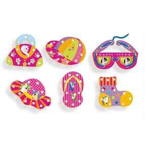 Composto de seis peças com temáticas de unicórnios em madeira de reflorestamento com furinhos para alinhavar e 6 cadarços coloridos.
