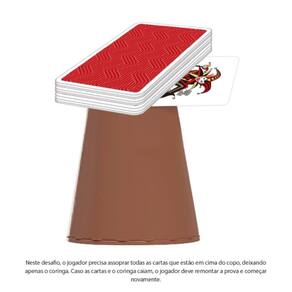 No primeiro, "Não Derrube o Coringa", o objetivo é assoprar todas as cartas de cima do copo, deixando apenas o Coringa, se ele cair, é preciso remontar tudo e tentar novamente.