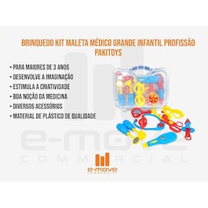 Brinquedo Kit Completo Maleta Médico Doutor Infantil Somos a E-MOVE.Trabalhamos com qualidade, velocidade e confiança nas suas compras.-------------------------------------------------------------------------------------------------------------------- Brinquedo Kit Completo Maleta Médico Doutor Infantil Descrição do Produto:Toda criança quem sonha com medicina, precisa se preparar o quanto antes O kit de medicina com acessórios é essencial para o seu mini profissional. Acompanha diversos acessórios. Todos dentro da maletinha de transporte, perfeita para a praticidade do mini doutor e da mini doutora. Aplicação:Para crianças acima de 3 anos. Benefícios:Desenvolve a imaginação, criatividade, aprendizado, eleva a autoestima e a atenção aos cuidados pessoais. Características Técnicas:Marca: Paki ToysMaterial: plásticoSegurança: CE-BRI/ICEPEX-NNBR 300/2004Assegurado pela INMETRONão recomendado para menores de 3 anos;Contém partes pequenas que podem ser engolidas Itens Inclusos:01 Maleta kit mini doutor grande
