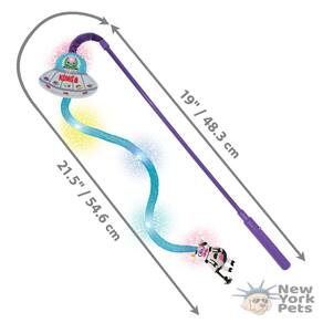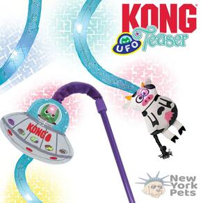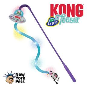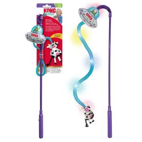 KONG Teaser UFO (objeto felino não identificado) possui luzes entre a varinha e a vaca. Aperte o botão para brilho estático, pisca-pisca ou pisca-pisca acelerado para uma aventura de outro mundo.