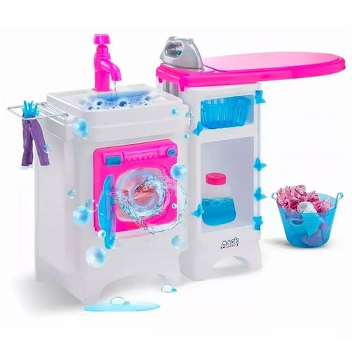 A Lavanderia vem nas cores branca com rosa e azul. Tem secadora, lavadora de roupas, tanque com torneira que sai água de verdade, varal com pregadores de roupas, armário para você guardar os acessórios. Vem também com lindos pertences que parecem de verdade. Com gavetinha e porta da lavadora abre e fecha. Divirta-se de montão!!