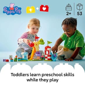 - PEPPA PIG BRINQUEDO – Crianças em idade pré-escolar a partir de 2 anos vão se deliciar com a diversão colorida de carnaval com o LEGO DUPLO Peppa Pig Funfair (10453) enquanto desfrutam de aventuras de brincar de conta com os personagens de seu programa favorito