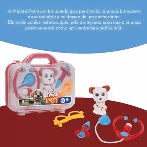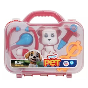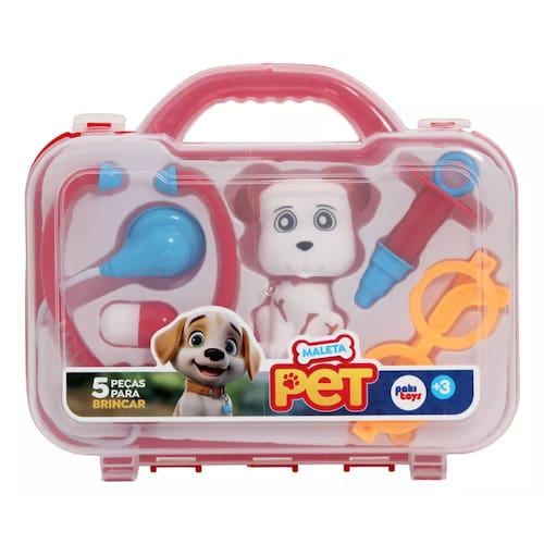 Vamos brincar de veterinário e cuidar do cachorrinho? Este adorável kit permite que as crianças explorem o mundo da medicina veterinária de forma divertida e educativa. Além do pet fofinho, a maleta traz óculos, estetoscópio, pílula e injeção para a criança se sentir um verdadeiro doutor. E quando a brincadeira acabar, é só guardar tudo na maleta de plástico e carregar para onde quiser!