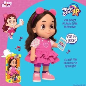 características: a boneca maria clara mede 32cm, e é articulada com o corpo e cabeça em vinil com a aparência muito fofa, ela possui cheirinho gostoso de bebê. Acompanha um celular de brinquedo e uma linda roupinha com tênis ela fala 14 frases divertidas