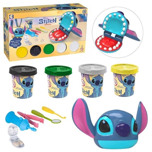 Brinquedo Stitch Dentista Disney - 2898 Com o brinquedo Massinha Stitch Dentista, a diversão é garantida enquanto as crianças exploram o mundo da imaginação e do cuidado com a saúde bucal. O kit vem com uma divertida boca do personagem Stitch, molde para criar dentes de massinha e diversos acessórios de dentista, como broca, espelho e pinça. As massinhas coloridas permitem criar dentes perfeitos ou até simular cáries, restaurações e limpezas, tornando a brincadeira ainda mais educativa. Ideal para estimular a criatividade, a coordenação motora e ensinar, de forma lúdica, a importância da higiene dental.