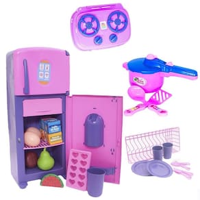 o kit vem com geladeira com comidinhas , escorredor com louça, fogão cooktop, panelinha de pressão com 2 talheres
