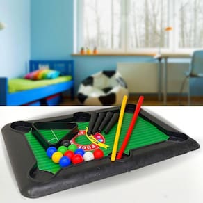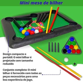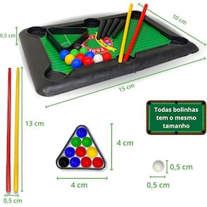 Loja oficial da europiobrinquedo mini mesa de sinuca bilhar jogo infantil portátil''Somos uma das lojas com mais variedades de brinquedos no paísAqui em nossa loja você encontra diversos brinquedos diferentes, de alta qualidade, trazendo segurança e qualidade em todos os nossos produtosPrezamos pela qualidade de nossos produtos, por isso todos os produtos são testados e conferidos antes do envioTodas nossas fotos e vídeos são reais, tiradas por nossa equipe buscando passar maior transparência para nossos clientes.= = = = = = = = = = = = = = = = = = = = = = = descrição = = = = = = = = = = = = = = = = = = = = = = = = = = = =Descubra a magia do mini bilharO divertido brinquedo de mini bilhar para criançasApresentamos a você o mini bilhar, uma experiência incrível em tamanho reduzido para os pequenos amantes de jogos de bilhar este emocionante brinquedo de mesa foi projetado especialmente para crianças, oferecendo horas de diversão e aprendizado de forma segura e envolvente.Por que o mini bilhar é o brinquedo perfeitoSocialização e cooperação: este brinquedo promove momentos de interação entre amigos e familiares, ensinando às crianças a importância da cooperação e compartilhamento.Compacto e portátil: o tamanho reduzido do mini bilhar permite que ele se encaixe perfeitamente em qualquer ambiente, seja em casa, no quintal ou em uma festaUm presente inesquecívelO mini bilhar é o presente perfeito para aniversários, festas ou receber seus pequenos campeões em qualquer ocasião prepare-se para testemunhar sorrisos radiantes e momentos especiais compartilhados com amigos e família.Junte-se à diversão agoraGaranta momentos mágicos de diversão e aprendizado com o mini bilhar desperte o talento dos seus pequenos para o bilhar enquanto eles se divertem de maneira segura e envolvente.Peça já o seu mini bilhar e proporcione aos seus filhos uma experiência incrível que ficará para sempre em suas memóriasMini bilhar de brinquedo.Funções: design compacto e portátil: o mini bilhar é projetado com tamanho reduzido, ideal para espaços menores, permitindo que seja facilmente colocado em quartos, salas de estar ou áreas de lazer. Além disso, sua portabilidade permite que as crianças o levem para onde desejarem.Materiais seguros e resistentes: o brinquedo é fabricado com materiais de qualidade e seguros, garantindo a proteção das crianças durante o jogo e a durabilidade do produto.Conjunto completo: o mini bilhar é fornecido com todas as peças necessárias para uma boa experiência de jogoIdeias de brincadeira:Mini torneio de bilhar: organize um torneio de bilhar em família ou com os amigos. Divida as crianças em times e faça um campeonato com várias rodadas. Ao final, premie as equipes vencedoras com pequenos prêmios ou certificados.Bilhar de pontuação crescente: cada vez que uma criança acerta uma bola na caçapa, ela ganha pontos. A cada acerto, a avaliação aumenta, e a criança que consegue acumular mais pontos ao longo do jogo é a vencedora.O que você vai receber em sua casa conteúdo da embalagem - 1 mini mesa de bilhar- 2 mini tacos de bilhar- 1 mini triangulo de bilhar- 4 mini protetores de taco- 11 bolinhasMedidas aproximadas:Altura: 0,5 cmLargura: 10Comprimento: 15Material: plásticoIdade recomendada:Recomendável para crianças maiores de 4 anos.P: quando meu produto será postadoR: a postagem é feita em até um dia depois após a confirmação da compraP: comprando hoje, quando recebo o produtoR: após a compra você receberá a nota no seu endereço eletronico.= = = = = = = = = = = = = = = = = = = = = = = = = = = = = = = = = = = = = = = = = = = = = = = = = = = = =Caso tenha mais alguma dúvida faça sua pergunta para nósHomologação Inmetro: 7561/2022-BRI-1 Marca: Europio