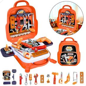 Conteúdo da embalagem 1 maleta 3 em 1 mochila, bancada e caixa 1 chave de fenda 1 martelo 1 alicate 1 serra 1 chave inglesa 1 parafusadeira de brinquedo Parafusos e porcas Placas de montagem Acessórios variados de construção plástico