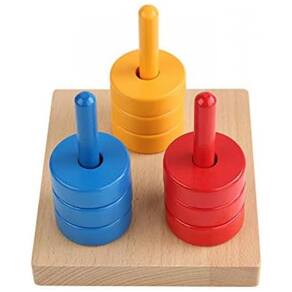 Este material permite que a criança empilhe os discos. A criança também deve fazer um exercício simples de correspondência, colocando os discos da cor certa na cor certa do pino.