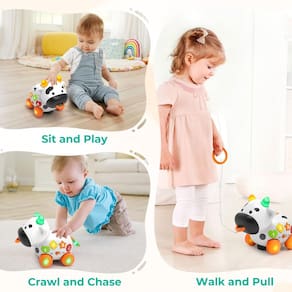 Brinquedos para bebês de 12 a 18 meses 1 ano de idade brinquedos bilíngues para bebês de 1 ano de idade brinquedos infantis 6 a 12 meses presentes de aniversário para meninos 1 ano de idade brinquedos de aprendizagem para meninos de 1 + ano de idade presentes de bebê brinquedo musical vaca brinquedo musical bilíngue brinquedos educativos para bebês de 1 ano de idade brinquedos musicais anos para bebês de 6 a 12 meses, presentes de primeiro aniversário para meninos de um ano de idade, presente de aniversário de um ano de idade, brinquedos para meninas de 9 meses, brinquedos para bebês de 6 a 12 meses, brinquedos infantis de 6 a 12 meses, brinquedos infantis de 12 a 18 meses, brinquedos para meninos de 12 meses, brinquedos bilíngues para 1 ano de idade brinquedo para menina de 1 ano de idade brinquedo para meninas de 12 anos menino menino ano brinquedos de 1 ano - Brinquedo de desenvolvimento inicial 5 em 1: brinquedos infantis multifuncionais com luz e música coloridas, aprendendo ABC e 123, tocando 9 canções de bebê, brinquedo de engatinhar e brinquedo de vaca para puxar. Brinquedo de desenvolvimento perfeito para crianças de 6, 7, 8, 9, 12, 18 meses. - Incentive o bebê a engatinhar e andar: 2 modos de movimento, movimento eletrônico ou puxado por cabos. Bebês de 9 a 12 meses adoram engatinhar e pegar a vaca quando ela se movimenta. E crianças de 12 a 18 meses adoram andar em ambientes internos e externos puxando-o. Um ótimo companheiro nos diferentes estágios de desenvolvimento das crianças, de sentar a engatinhar, de caminhar a correr. - Seguro e amigável para bebês: Feito de ABS livre de BPA, bordas lisas arredondadas e durável o suficiente para anos de uso. O botão é grande e sensível, fácil para mãos pequenas pressionarem. 2 níveis de volume para escolher, o suficiente para chamar a atenção dos pequenos e não muito alto para os pais. - Bilíngue e educacional: modos inglês e espanhol, brinquedo bilíngue para bebês aprendendo 123, ABC e músicas para bebês. Desenvolve capacidade cognitiva, coordenação olho-mão enquanto desenvolve habilidades motoras grossas. Brinquedo educativo para meninos e meninas de 1 ano ou mais. - Presentes ideais para 6-12-24 meses: Vem com uma bela caixa. 3 pilhas AA necessárias, não incluídas. Ótimo presente de Páscoa para crianças de 1 a 2 anos, 12 e 18 meses, presentes de Natal para crianças de 1 a 2 anos, presentes de primeiro aniversário para meninos e meninas de um ano.