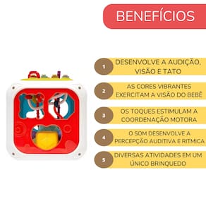 Transforme o tempo de brincadeira em momentos de crescimento e alegria com o Cubo Multiatividades. Prepare-se para testemunhar os primeiros passos em direção a um futuro brilhante enquanto seu pequeno explorador se aventura neste mundo de maravilhas sensoriais!