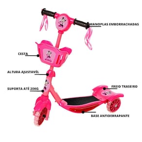 Patinete de tres rodas, cestinha, criança, infantil, dm toys, led, feminino, rosa, meninos, brinquedo, meninas, minnie, mouse, mickey, disney, desenho..