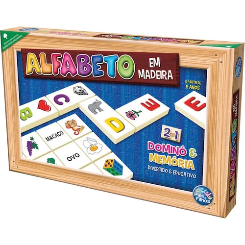 Alfabeto em madeira 2 em 1, Dominó e Memória. Jogo didático. Idade: a partir de 6 anos. Dominó as peças devem ser misturadas com as faces voltadas para baixo. Cada jogador deverá escolher 7 peças, inicia o jogo aquele que apresentar a peça com 2 letras iguais seguindo a ordem aeiou. A forma certa de dar sequência nesses carretões é desenho + carretão + letra, ou vice e versa. O vencedor é aquele que primeiro conseguir encaixar todas as suas peças na corrente. Contém 31 peças. Memória as peças devem ser misturadas com as faces voltadas para baixo. Escolha quem dará início ao jogo. Tente encontrar as 2 peças que se completam desenho mais o respectivo nome. O vencedor será aquele que conseguir formar o maior número de pares.