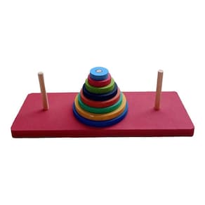 a torre de hanói constitui num jogo estratégico capaz de contribuir no desenvolvimento da memória, do planejamento e solução de problemas através de técnicas estratégicas. O jogo se apresenta em uma base que possui três pinos na posição vertical. No primeiro pino temos uma sequência de quadrados com ordem crescente de diâmetro, de cima para baixo. O objetivo é passar todos os quadrados para o último pino com a ajuda do pino central, de modo que no momento da transferência o pino de maior diâmetro nunca fique sobre o de menor diâmetro. Indicado para a partir de 7 anos. Medidas aproximadas: base: 9cm x 32cm x 10cm quadrado maior: 9cm quadrado menor: 4cm espessura do quadrado: 0,7cm