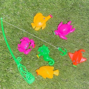 - 10 kit com 7 peças, sendo 6 peixinhos e 1 vara de pesca