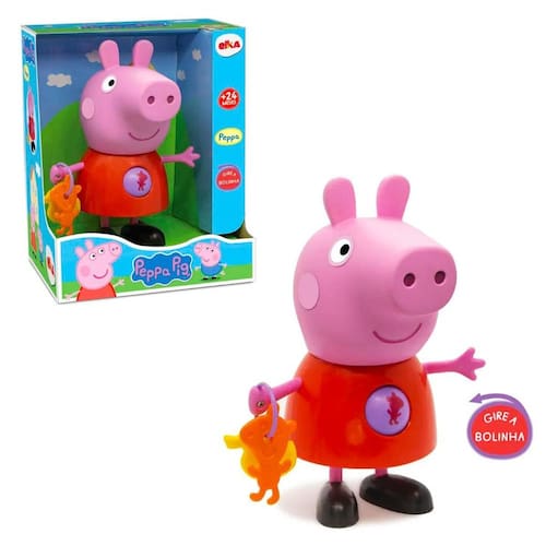 A peppa pig com atividades Brincar com a peppa e o george é pura diversão Brinque com o super boneco da peppa. Boneco com 24 cm de altura, bolinha que gira na barriguinha, e os brinquedos preferidos dela na mão. Para brincar e levar para onde quiser Garanta já a sua