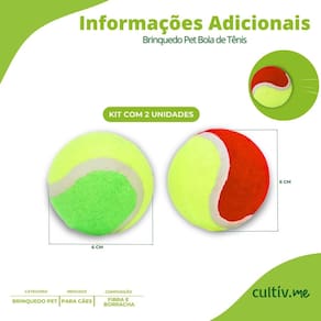 * Tipo: Brinquedo pet / Bola de tênis para cães * Material: Fibra Química e Borracha * Quantidade: 2 unidades * Cores: Verde e Amarelo / Vermelho e Amarelo * Função: Entretenimento, estímulo físico e mental * Indicação: Cães de todos os portes * Validade: Indeterminada
