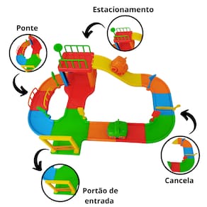 Conteúdo da embalagem: - 12 placas de pista coloridas - 02 estruturas para garagem - 02 grades de segurança reta - 02 grades de segurança curvas - 05 placas - 01 farol - 01 cancela - 01 portal de entrada - 01 portão de entrada