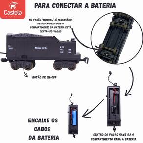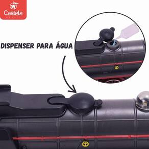 Conteúdo da Embalagem: 4 vagões, trilhos, 1 árvore, 1 bateria recarregável, 1 recipiente para água