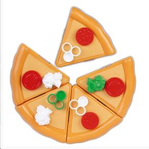 Conteúdo da Embalagem: 06 Fatias de pizza, 02 tomates, 02 pepperoni, 02 brócolis, 02 couve flor, 02 anéis de cebola, 02 azeitonas, 01 cortador de pizza e 08 cartinhas cartonadas