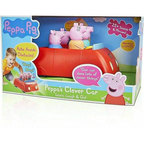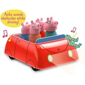 Brinquedo pré-escolar interativo Clever Car da Peppa Pig com luzes e sons - Dirige sozinho - toca música e fala da Peppa - Veículo motorizado com sensores de prevenção de colisões - vermelho - EVITA AUTOMATICAMENTE OBSTÁCULOS Pressione o volante e o carro inteligente da Peppa dirige sozinho. Os sensores integrados detectam obstáculos e o carro muda de direção para evitar choques e estrondos. Ensina a combinação de cores. Luzes e sons ajudam seu filho a combinar o personagem certo com a cor correta do assento. O Peppa's Clever Car sabe quando você acerta - LUZES E SONS Faróis funcionando, assentos piscando e frases de 25 caracteres e sons de carros fazem deste um brinquedo do qual meninas e meninos de todas as idades nunca se cansarão. - INCLUI 4 PERSONAGENS DA PEPPA PIG. Figuras de toda a família estão incluídas: Peppa, George, Mummy Pig e Daddy Pig - BRINQUEDO AUTORIZADO DA PEPPA PIG: O Peppa Pig's Clever Car é uma mercadoria oficialmente licenciada pela eOne Entertainment. Funciona melhor em superfícies lisas. Não é adequado para carpetes empilhados médios ou longos. REQUER 3 pilhas AA não incluídas.
