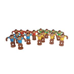 -01 Brinquedo Pula Macaco -16 Macaquinhos saltitantes -04 Catapultas em cores diferentes vermelho, azul, verde e amarelo -02 Círculos de folhas para aumentar o desafio -adesivos para colar e ilustrar os macacos -manual de instruções