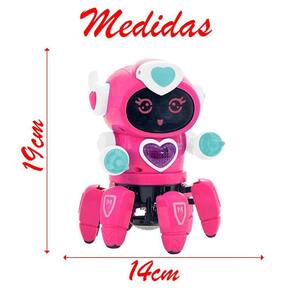 - Toca Música - Luzes - Mexe os braços - Mexe as Pernas (6 perninhas) - Botão liga e desliga - Utiliza 3 Pilhas AA (não inclusas)