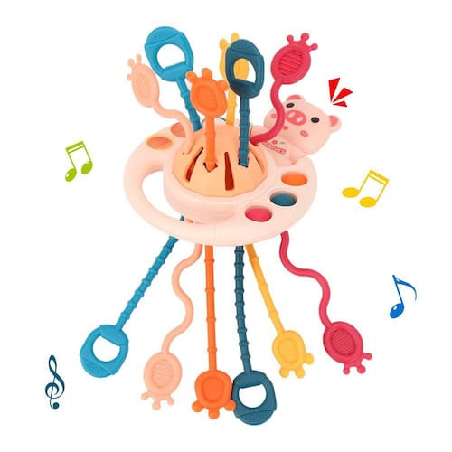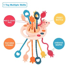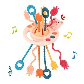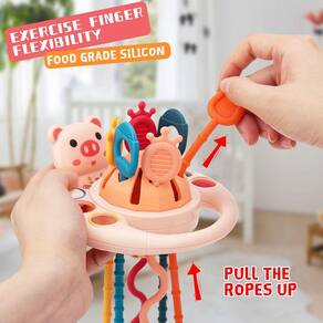 -?Funny Play?6 cordas com várias texturas, fáceis de amarrar e puxar, que ajudarão a fortalecer as habilidades motoras finas e grossas. O material de silicone de qualidade alimentar é macio e elástico, o que pode proteger bem as mãozinhas do seu bebê. O desenho Animal Rattle pode ser um toque nítido para atrair a atenção do bebê.