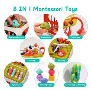 ?Brinquedos Montessori 8 em 1?Brinquedo multifuncional para manter o bebê ocupado. Os bebês aprendem a colocar blocos dentro e fora das caixas, combinar formas, empilhar blocos, puxar cordas, girar ventosas e muito mais. É um brinquedo de aprendizagem para educação infantil, pode exercitar a coordenação motora e olho-mão fina.