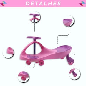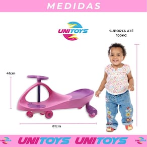 Especificações Técnicas: - Marca: Unitoys - Modelo: GIRA CAR - Cor: Rosa/Roxo - Materiais: Plástico e Ferro - Idade Recomendada: 3 a 10 anos - Peso Máximo Suportado: 35 kg - Dimensões: Comprimento: 81 cm, Largura: 44 cm, Altura: 41 cm - Peso do Produto: 2,850 g