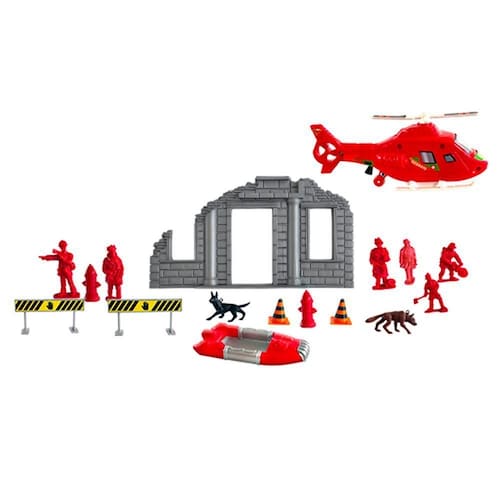 Conteúdo: 1 Kit Completo Brinquedo Super Resgate com 17 Itens: 6 Bonecos em Miniatura de Profissionais de Resgate, 2 Hidrantes em Miniatura, 2 Placas de Isolamento, 1 Peça de Cenário de Casa em Ruínas, 1 Bote de Resgate em Miniatura, 2 Cachorros Farejadores, 2 Cones e 1 Helicóptero de Resgate com Função