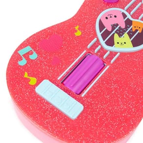 Brinquedo ukulele casa da gabby dollhouse com som infantil Cor: colorido Toque músicas com o ukelele da gabby. Aperte o botão kitty e cada uma das patas do gatinho nos trastes desta guitarra infantil, para percorrer 3 músicas, como o tema gabby's dollhouse, efeitos sonoros musicais e acordes de guitarra.