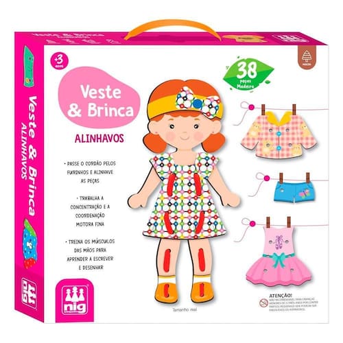 Alinhavar é uma atividade importante para treinar a coordenação motora fina e preparar a criança para escrever e desenhar. Nesse kit, a criança encontra: 1 boneca de 26cm 37 pecinhas com lindas roupas e acessórios 6 cadarços coloridos para prender as peças essa é uma atividade de inspiração montessoriana, que traz benefícios como aprimorar a coordenação olho-mão, percepção espacial e concentração. Atenção: imagem meramente ilustrativa. Pode ocorrer mudanças no tom da cor para o produto real ou mudanças na embalagem sem aviso prévio por parte do fornecedor/fabricante. Homologação Inmetro: CE-BRI/IQB 006075 54531/21-001