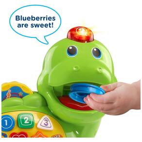 Explore cores, formas, números e alimentos com o Chomp and Count Dino da VTech. Coloque as peças coloridas na boca do dinossauro e veja como ele reconhece e come cada peça! Esse Dino está com fome, então alimente-o com um petisco saudável. O brinquedo de dinossauro reconhece as oito peças de alimentos coloridos e fornece respostas divertidas enquanto come cada uma. Este dinossauro de brinquedo introduz cores, alimentos, formas e contagem em dois modos: contagem ou refeição. Centro de aprendizagem precoce com 130 músicas, melodias, sons e frases. As crianças podem responder às perguntas do Dino com as peças de alimentos corretas. 5 botões de formas ensinam formas e números, e é possível girar o disco giratório para tocar músicas de cantar junto. O brinquedo interage quando é puxado ou empurrado. Possui controle de volume e desligamento automático. Indicado para crianças de 1 a 3 anos. 2 pilhas AA inclusas para demonstração, utilize pilhas novas para uso regular.