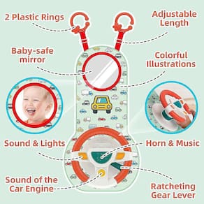 Brinquedos de assento de carro de bebê com espelho podem ser facilmente instalados em hastes de encosto de cabeça de assento de carro, carrinhos de bebê, cadeiras de balanço, berços, guarda-corpos, etc. Com anel ajustável, adequado para bebês de diferentes idades e cenários de uso. O brinquedo do banco do carro de condução multifuncional tem um volante e uma alavanca de engrenagem de catraca, um espelho de segurança para bebês, 3 sons e luzes, buzinas e música e ignição do motor. Thecarseat brinquedos para bebês 0-6 meses é projetado como um centro de jogo de carro, que pode entreter o bebê enquanto os pais estão dirigindo. Os pais não precisam mais se preocupar com o choro do bebê, porque eles têm um brinquedo interessante na viagem. Os bebês desenvolvem imaginação e habilidade prática, imitando as ações do motorista. Girar o volante e a alavanca de câmbio e pressionar vários botões ajuda a desenvolver as habilidades motoras finas das crianças e a coordenação olho-mão. O primeiro brinquedo de volante de presente de aniversário de Natal para o bebê de 0 a 12 meses pode ajudar os bebês a explorar e aprender à medida que crescem. Todos os produtos de nós foram submetidos a rigorosos controles de qualidade.se houver algum problema de qualidade ou você não está satisfeito com o productcontact us.we lhe daremos a melhor solução.