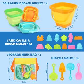 Brinquedos de praia para crianças - [Brinquedos de praia para crianças] O conjunto de 30 brinquedos de areia inclui 3 baldes dobráveis, 24 moldes e pás de praia coloridos e 3 sacos de malha de armazenamento (também como bolsa de coleção), vários acessórios ajudam várias crianças a se divertirem juntas. - [Material seguro e durável] Feito de material de alta qualidade, o brinquedo de areia infantil é macio e seguro, e tem bordas lisas e design de superfície para facilitar a limpeza após o uso. - [Brinquedos de areia para viagem] Acessórios de praia multicoloridos ajudam as crianças a várias maneiras de brincar na praia, brinquedos de castelo de areia dobráveis para conjunto de praia, incluindo castelos e moldes de conchas para construir seu próprio reino de castelo. - [Design de ideia criativa] A bolsa coletora de 3 conchas contém todos os moldes de areia, facilitando a sacudida da areia e da água. O conjunto de brinquedos de areia é adequado para famílias ou festas com várias crianças brincando na praia. - Amplamente utilizado: não só pode ser utilizado para viajar na praia, mas também para uso diário. a bolsa de praia pode ser usada para armazenamento e o balde dobrável pode ser utilizado para armazenamento de água para limpeza diária.