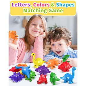 - Conjunto de 26 unidades de dinossauros Alphabet: este conjunto de brinquedos de dinossauros inclui um pacote econômico com 26 dinossauros ABC de dupla face, 1 bolsa com cordão e 1 caixa de armazenamento. As formas fofas de dinossauros são adoradas pelas crianças, por isso elas têm um grande interesse em encontrar e combinar letras.