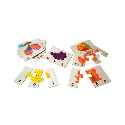 Conjunto confeccionado em MDF, contendo 48 peças encaixáveis, formando 12 quebra cabeças, cada uma medindo 140x110x2,8mm. Acondicionado em caixa de madeira.