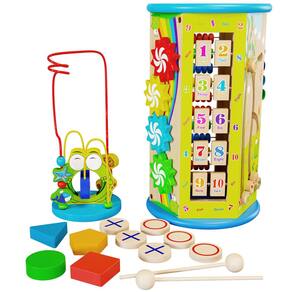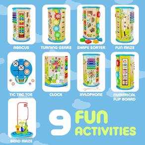 - 9 ATIVIDADES DIVERTIDAS EM 1 - Este cubo de atividades para crianças de 1 ano é um cubo de atividades em madeira para meninos e meninas se divertirem sozinhos ou com um companheiro de brincadeira! Inclui um brinquedo de labirinto de miçangas, brinquedo de ábaco, engrenagens giratórias, tic tac toe, relógio, flip board numérico, classificador de formas, xilofone e labirinto divertido.
