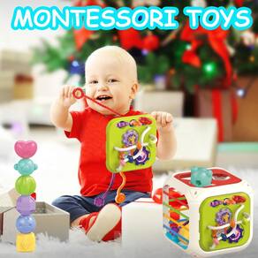 - Brinquedos Montessori 7 em 1: esses brinquedos didáticos permitem que seus filhos joguem 7 jogos em 1 brinquedo: o brinquedo sensorial pode ser utilizado para exploração espacial por corda elástica para crianças pequenas, combinação de formas de blocos de atividades, blocos de empilhamento, brinquedos com cordão, engrenagens giratórias, miçangas giratórias e xilofone para bebês.