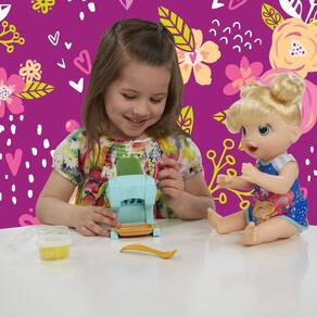 A boneca Baby Alive inclui uma máquina de fazer macarrão que permite que as crianças preparem o lanche para seu bebê e depois a alimentem!