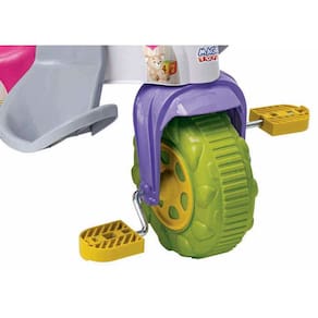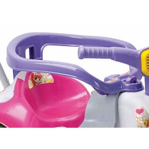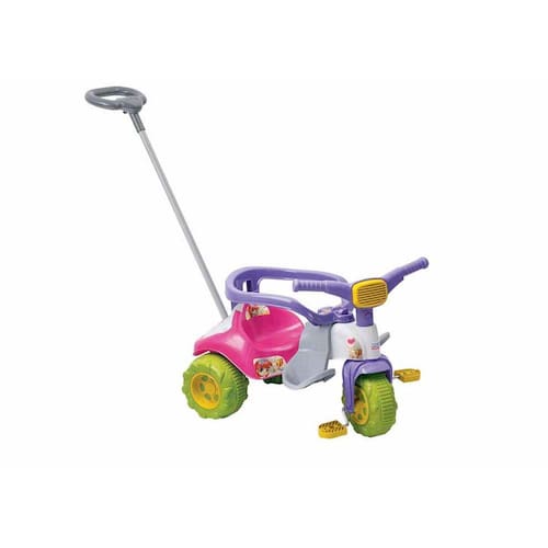 O Triciclo Infantil Tico Tico Zoom Meg Com Aro possui assento anatômico, haste direcionável para empurrar removível, suporte para os pés, aro de proteção removível e Rodas Grandes.