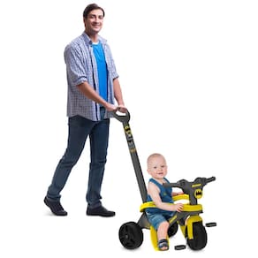 Com a sua função passeio, o adulto utiliza a haste (não direcionável) para movimentar o triciclo. Já na função pedal, permite à criança brincar livremente como um triciclo convencional.