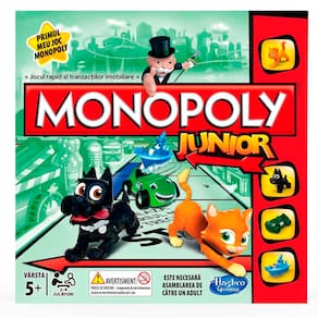Bem-vindo ao primeiro Monopoly Junior. Agora as crianças podem experiemntar de uma maneira mais rápida e divertida o jogo mais clássico de compra e venda de propriedades. Com Mecânica simplificada e notas de um único valor tornam o jogo mais rápido e fácil de ser jogado.